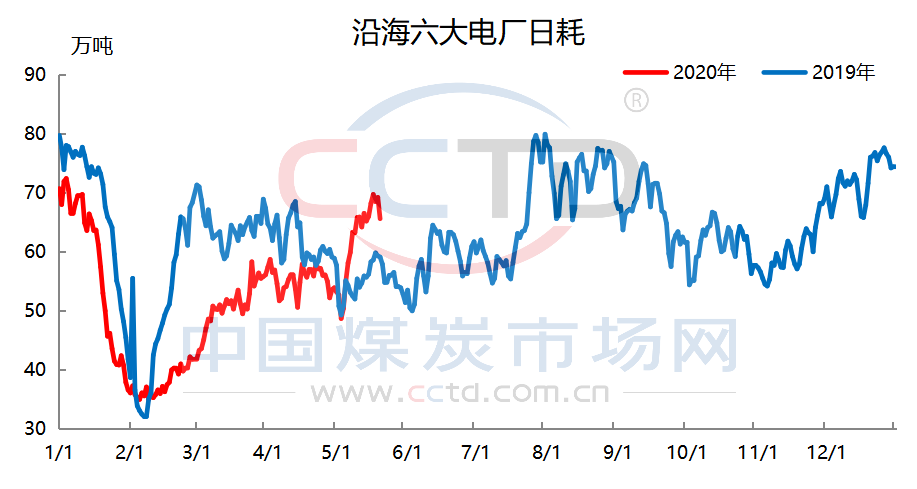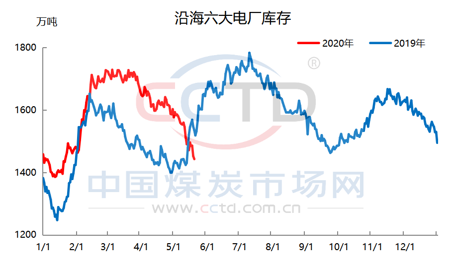 据CCTD监测数据显示,沿海六大电厂日耗同比大幅上升。5月1日-20日,沿海六大电厂日均耗煤61.96万吨,月环比增加12%,同比增加12.4%;库存持续下降,截止5月20日,沿海六大电厂库存为1442.83万吨,较5月1日减少134.27万吨,同比减少92.27万吨。