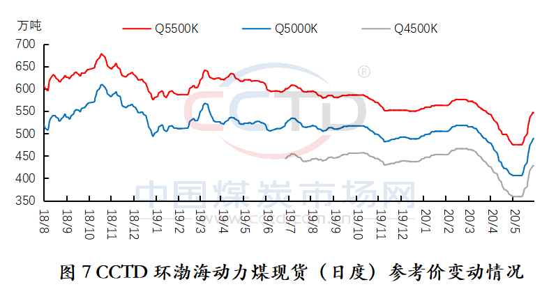 北港库存持续下降,叠加进口煤收紧预期增强,市场看涨情绪高涨,贸易商报价不断上调,截至5月27日,CCTD环渤海5500大卡动力煤现货(日度)参考价为546元/吨,较5月初上涨71元/吨,涨幅14.9%,其中,5月18日至5月25日加速上涨,日均涨幅超过8元/吨。