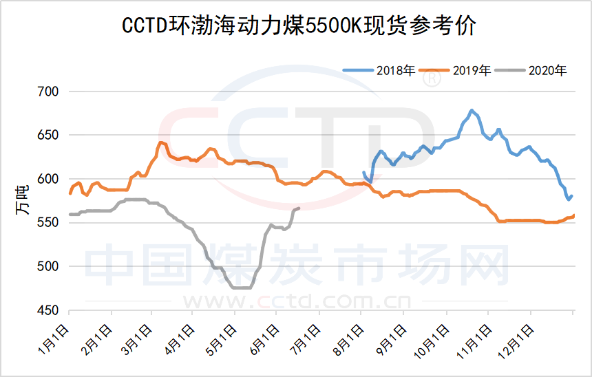 从上图中可以看出,2020年上半年CCTD环渤海动力煤5500K现货参考价最低点为475元/吨,最高576元/吨;比19年低点低76元/吨,比19年高点低65元/吨。
