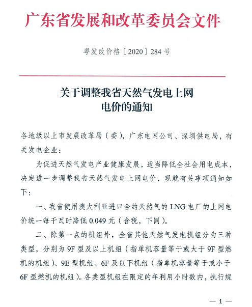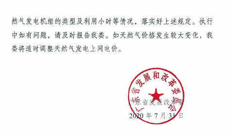 广东省调整天然气发电上网电价