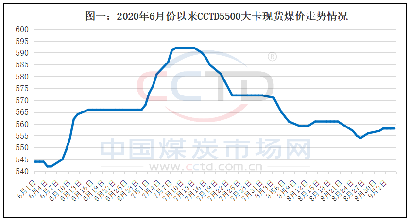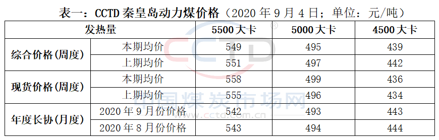 本报告期(8月29日至9月4日;下同),“CCTD秦皇岛动力煤价格”所采集环渤海地区三种动力煤的周度综合价格略有下降、周度现货价格有所回升(见表一)。其中,“CCTD 5500综合”和“CCTD 5000综合”的周度均价分别报收于549元/吨和495元/吨,均比8月28日发布的价格下降了2元/吨;“CCTD 5500现货”和“CCTD5000现货”的周度均价分别报收于558元/吨和499元/吨,均比8月28日发布的价格上涨了3元/吨。