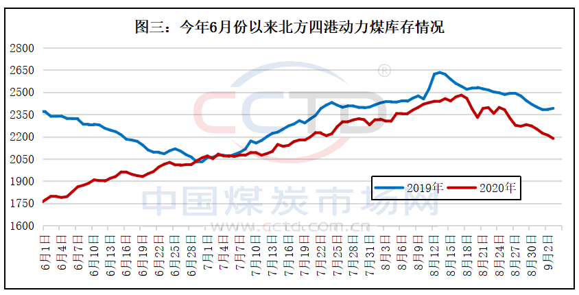 第二,上下游港口动力煤库存下降明显。统计数据显示,一方面,从8月中旬开始,北方发运港口、下游中转和接卸港口的动力煤库存普遍呈现持续下降局面,对北方港口现货煤价逐渐产生支撑作用,其中9月3日北方四港(秦皇岛港、曹妃甸港、京唐港和黄骅港)的动力煤库存比8月17日的近期高点下降了292.5万吨(见图三),低于去年同期水平203.3万吨;另一方面,北方港口动力煤库存逐渐减少的同时,低硫动力煤品种的库存愈发不足,近期溢价效应突出,对港口现货煤价产生一定拉动作用。
