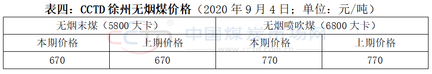 本报告期(见表四),CCTD徐州无烟末煤报收于670元/吨、徐州无烟喷吹煤报收于770元/吨,均继续与8月28日发布的价格持平。