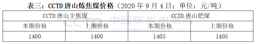 本报告期(见表三),CCTD唐山主焦煤和CCTD唐山肥煤的价格分别报收于1400元/吨和1405元/吨,均与8月28日发布的价格持平。