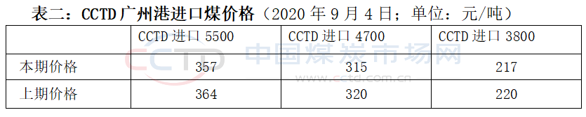 本报告期(见表二)“CCTD广州港进口煤价格”所采集的各种热值进口动力煤的交易价格继续下降,其中5500大卡和5000大卡的进口动力煤价格分别比8月28日发布的价格下降了7元/吨和5元/吨。
