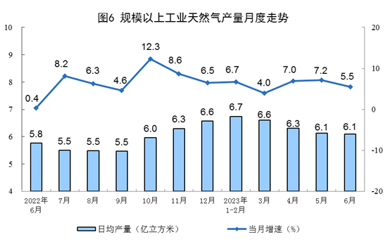 天然气生产平稳增长,进口增速较快。上半年,生产天然气1155亿立方米,同比增长5.4%。进口天然气5663万吨,同比增长5.8%。6月份,生产天然气183亿立方米,同比增长5.5%。