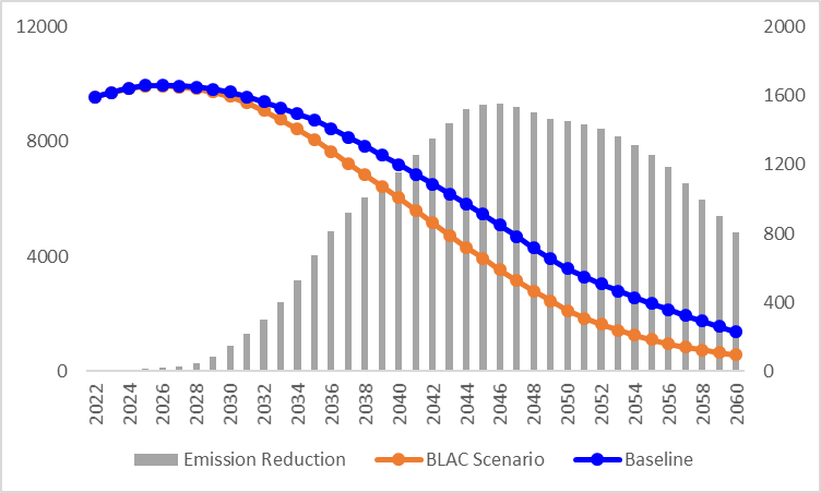 下图展示了基线情景和BLAC情景中半弹性下的排放差异,其中灰色是预测的年度减排量。灰色所代表的预测年度减排量总和超过338亿吨,这意味着采取更“激进”的政策将导致碳减排超过338亿吨。
