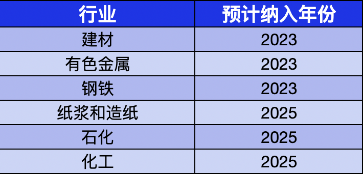 上图是我们对2021年至2060年全国碳市场的排放预测和配额供应结果。由于欧盟方面引入碳边境调节机制,我们更改了钢铁行业纳入时间的预期,改为2023年,详细时间表如下。