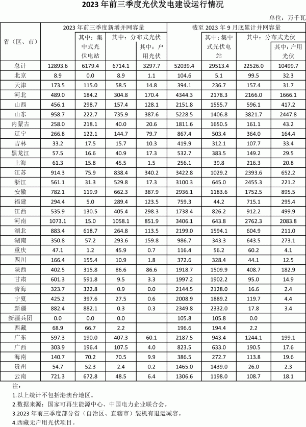 国家能源局发布2023年前三季度光伏发电建设运行情况。根据数据得知,2023年前三季度,全国光伏新增装机12894万千瓦,同比增长145%,其中集中式光伏6180万千瓦,分布式光伏6714万千瓦。截至2023年9月底,全国光伏发电装机容量达到5.2亿千瓦,其中集中式光伏2.95亿千瓦,分布式光伏2.25亿千瓦。