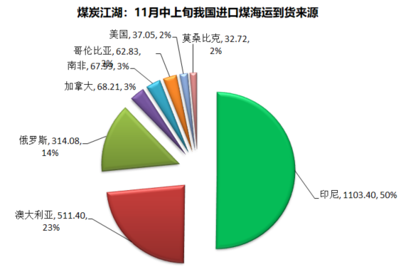 据煤炭江湖独家统计数据显示,11月中上旬,我国进口煤海运到货量累计为2198万吨,比10月同期增加了605万吨。其中印尼煤到货量1103万吨,占比50%,合计196艘船;澳煤到货量511万吨,占比23%,合计48艘船;俄罗斯煤到货量314万吨,占比14%,合计69艘船。