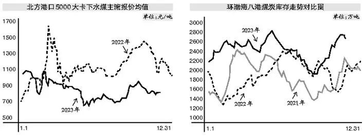从10月中旬开始,市场煤价格进入一个回落期,下跌趋势一直延续到11月初。价格回落后,贸易商看涨情绪升温,询货有所增多,加上第一次寒流来袭且水电进入快速回落期,煤炭市场受到一定带动,价格企稳反弹。随后在高库存的压制下,市场情绪又开始转弱。进入11月下旬,当港口5000大卡下水煤价格再次回落至每吨800元左右时,供应方出货意愿降低,叠加第二波寒潮降温来临,市场对电厂日耗回升有一定预期,价格小幅反弹。但这波寒潮影响时间较短,后续多地气温有所回升,且沿海地区受影响较小,电厂日耗环比增速略有放缓。电厂在高库存的情况下,对高价接受程度有限,叠加港口高库存疏港压力加大,市场煤价格反弹支撑不足,短暂上涨后开始企稳。