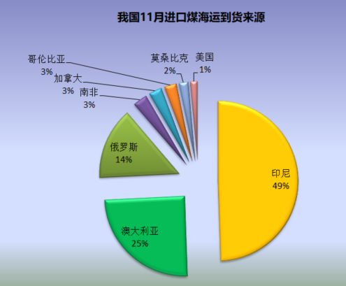 据煤炭江湖独家统计数据显示,今年11月我国进口煤海运到货量中,印尼煤到货量为1579万吨,合计284艘船,占比为49%;澳煤到货量为790万吨,合计80艘船,占比为25%;俄罗斯煤到货量为461万吨,合计104艘船,占比为14%。其余包括南非、加拿大、美国等地区煤炭到货量合计为361万吨,共42艘船。