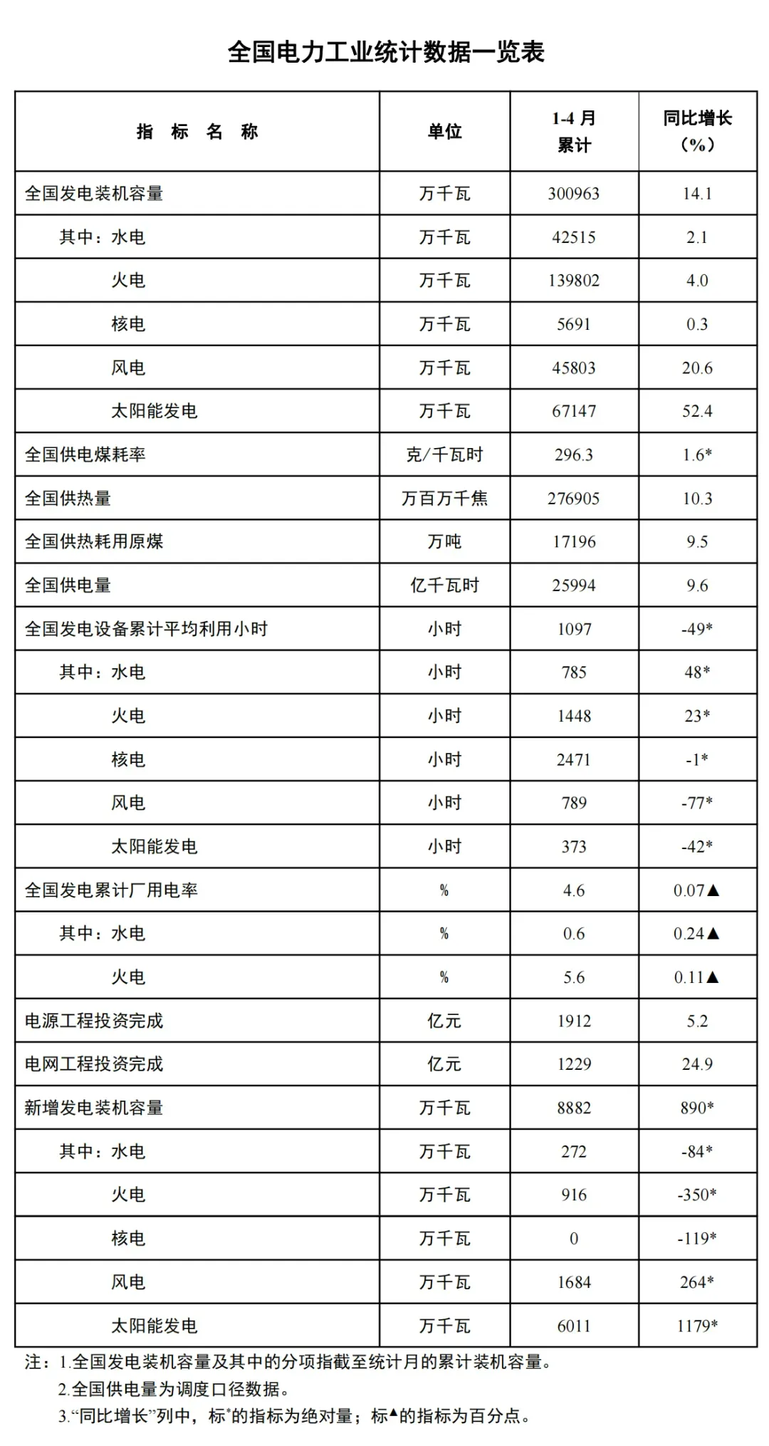 5月23日,国家能源局发布1-4月份全国电力工业统计数据。