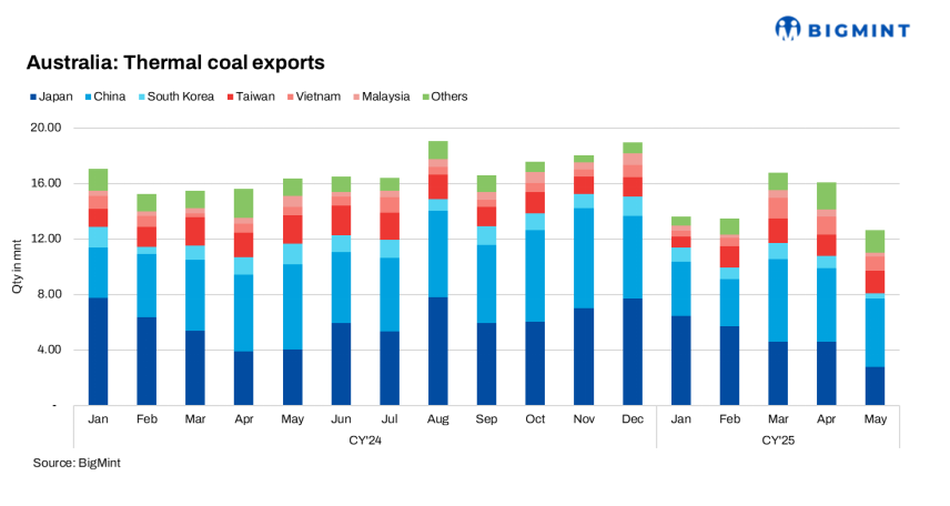 据BigMint 6月24日发布的信息,2025年5月,澳大利亚动力煤(非焦煤Non-coking coal)出口量大幅下降至1262万吨,较4月份的1608万吨减少21.5%;与去年同期的1636万吨相比,降幅更为明显,达到22.8%。