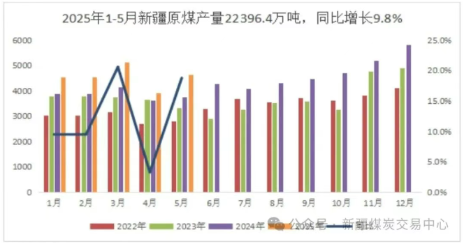 供应端:2025年,在煤炭市场持续低迷的背景下,新疆原煤产量仍保持强劲增长态势。从长期趋势来看,新疆已成为全国煤炭主产区中增长最为显著的地区。数据显示,2021-2024年期间,新疆原煤产量从3.21亿吨跃升至5.41亿吨,年均复合增长率达13.9%,累计增量达2.2亿吨。特别是在2022年突破4亿吨产能后,仅用两年时间就实现了5亿吨的产能跨越,展现出强劲的产能扩张势头。从2025年1-5月的生产数据来看,在全国四大煤炭主产区中,新疆以9.8%的同比增速领跑,显著高于内蒙古(0.9%)、陕西(3.1%),仅次于山西(13.6%)。