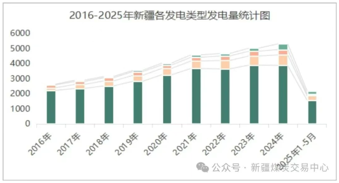 煤电方面:2025年1-5月,新疆总发电量2187.23亿千瓦时,同比下降1.1%,反映出区域电力需求整体承压;从电力结构看,火电发电量1568.2亿千瓦时,同比下降3.8%;水力发电量119.5亿千瓦时,同比增长9.1%;风力发电量301.3亿千瓦时,同比下降4.4%;太阳能发电量195.15亿千瓦时,同比增长25.6%。数据表明新疆能源结构持续优化,可再生能源占比提升(合计615.95亿千瓦时,占总发电量28.2%),但火电仍为主导(占比71.7%)。