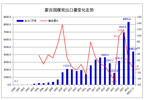 7月份,蒙古国煤炭出口量为653.76万吨,同比下降5.6%,环比增长7.2%。其中,硬煤出口626.87万吨,同比下降5.7%,环比增长9.0%;褐煤出口26.89万吨,同比减少3.1%,环比下降22.7%。