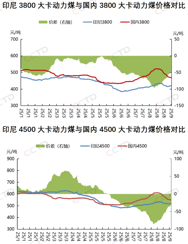 自8月下旬以来,由于国内煤炭供应情况较好,叠加水电出力大幅增加,终端耗煤需求有所减弱,内贸煤价格开始止涨下行。进入9月后,随着北方多地气温下降,南方地区高温强度也有所下降,电厂日耗出现回落,内贸煤价继续弱势运行。受此影响,终端对进口煤的采购也多持谨慎观望态度,市场交投活跃度较前期有所降低。除中国外,印度受降雨影响终端耗煤需求继续疲软,印尼的两大主要出口国需求表现均略显低迷,导致印尼煤价也出现小幅下降。虽然内外贸煤价差有所收窄,但目前进口煤尤其是进口低卡煤仍保持一定的价格优势,近期电厂仍在继续释放招标需求。