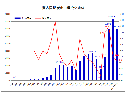 据蒙古国海关机构(Mongolian Customs Service)发布的统计数据显示,2025年1-10月,蒙古国煤炭出口量累计为6973.43万吨,比上年同期增加124.1万吨,同比增长1.8%。
