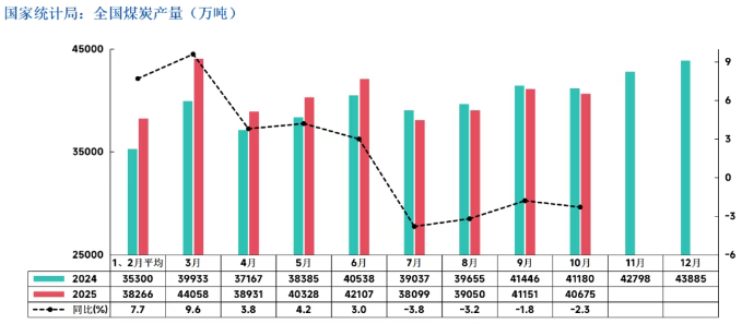 10月份北方降水显著偏多,对露天煤矿生产和煤炭运输造成一定扰动。同时,超产核查仍在推进,叠加四季度安监力度惯常加大,多重因素共同导致产量环比停止增长、同比降幅扩大。在此背景下,短期煤炭供应大概率延续偏紧态势,全年原煤累计增速或进一步降低。