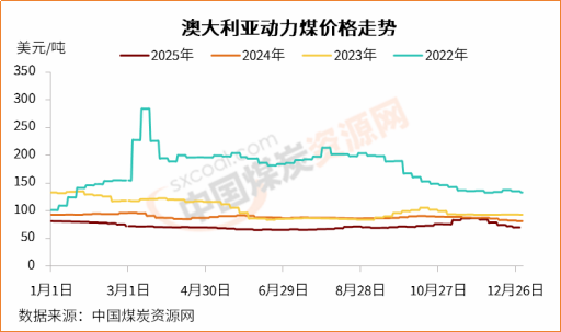 过去一周,由于气候温和导致主要进口国取暖用煤需求疲软,澳大利亚动力煤价格同样走弱。截至12月24日,纽卡斯尔港5500大卡动力煤价格为70.31美元/吨,较之前一周下降4.35美元/吨,较上月同期下降16.65美元/吨。相比而言,6000大卡煤价格较前一周下跌超2美元,维持在106美元/吨左右。