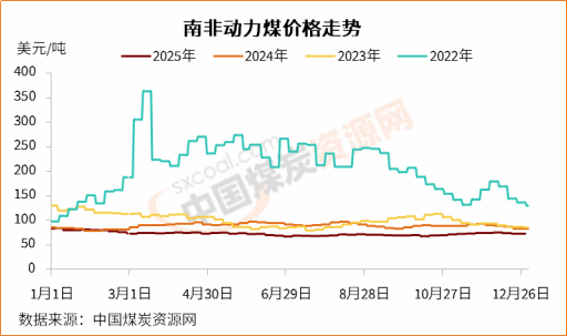 截至12月24日,南非理查兹湾5500大卡动力煤离岸价为73.26美元/吨,较前一周下降1.1美元/吨,较前一月下降1.29美元/吨。同时,南非6000大卡煤离岸价同样延续跌势,较前一周下降近3美元/吨。
