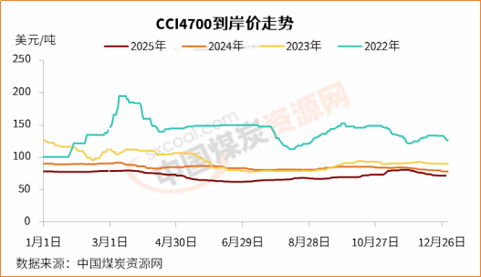 截至12月26日,CCI进口3800大卡动力煤中国南方港到岸价为53美元/吨,较前一周持平;CCI进口4700大卡动力煤到岸价为72美元/吨,较前一周下降0.5美元/吨;CCI进口5500大卡动力煤到岸价为85美元/吨,较前一周下降4.7美元/吨。