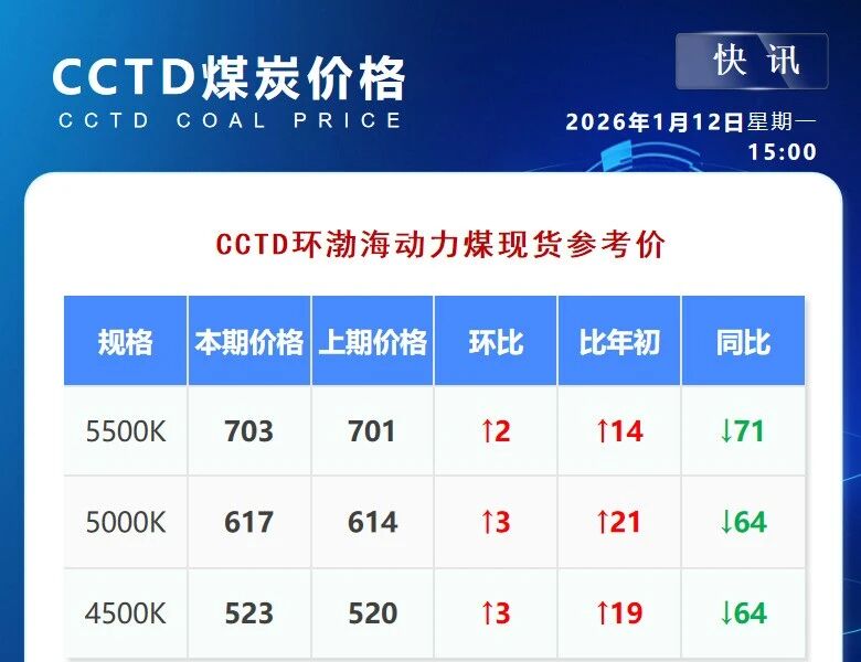 12月底以来,动力煤市场供需关系有所改善,悲观情绪明显缓解,价格则持续温和上涨。截至1月12日,“CCTD环渤海动力煤现货参考价”5500K、5000K、4500K三个规格品分别收于703、617、523元/吨,日环比上涨2、3、3元/吨,累计反弹18、29、33元/吨。