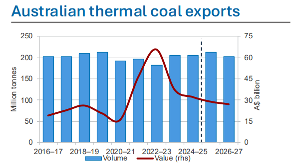 2025年12月份,澳大利亚工业、科学和资源部最新发布的《资源与能源季报》显示,随着全球主要用煤国家加速发展新能源、逐步减少燃煤发电的使用,全球动力煤贸易正面临长期缩减情况。