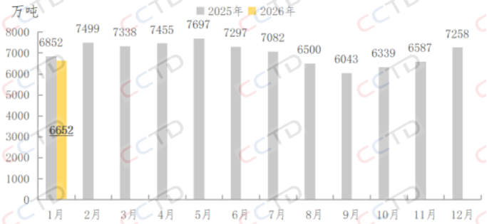 1月份,主流港口煤炭库存明显下降。临近年末,煤矿生产以保安全为主,供给端小幅收缩,叠加发运到港价格持续倒挂,贸易商发运积极性一般,港口铁路运量较上月有所下降。同时,寒潮天气促使电厂日耗持续高位,加上春节前补库需求陆续释放,推动本月主流港口库存加速下降。截至1月26日,CCTD主流港口煤炭库存6652万吨,同比下降2.9%,月环比下降8.4%。