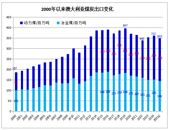 2025年全年,澳大利亚动力煤出口量累计为2.0533亿吨,与2024年的2.0284亿吨相比,同比下降1.2%。