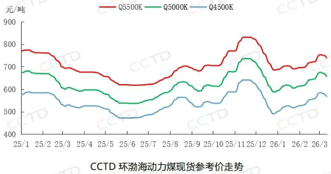 近期,北方港口煤炭库存持续增加,同时,受电煤消费淡季临近影响,终端采购意愿偏低,煤价偏弱运行。截至3月12日,“CCTD环渤海动力煤现货参考价”5500K、5000K、4500K三个规格品价格分别收于740、657、568元/吨,日环比分别下降4、5、4元/吨,较前期高点分别下降13、18、17元/吨。