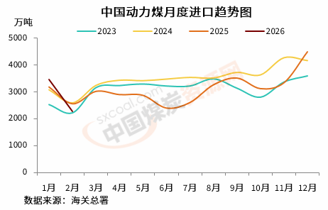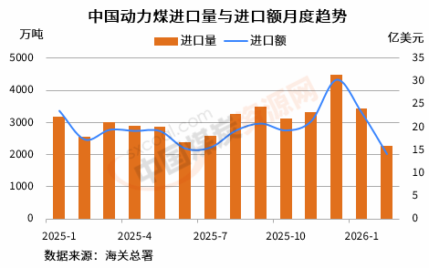 海关总署最新数据显示,2026年2月份,中国动力煤(非炼焦煤)进口量为2287.3万吨,较上年同期的2551.1万吨减少10.34%,较前一月的3452.25万吨下降33.74%。
