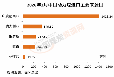 分来源地来看,2026年2月份,中国动力煤进口主要来源国为印尼、澳大利亚、俄罗斯、蒙古和菲律宾,我国从前五大来源国进口动力煤占进口总量的99.6%。