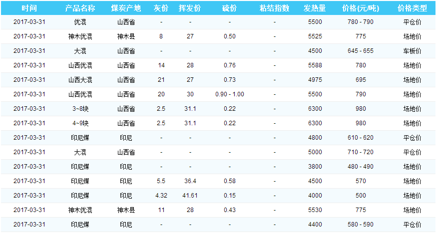 2017年3月31日广州港煤炭价格