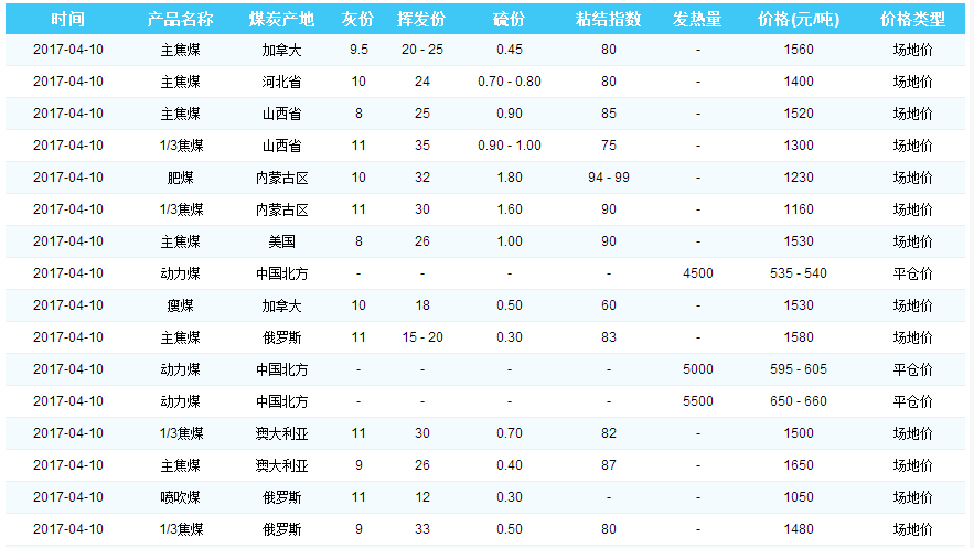 2017年4月10日京唐港煤炭价格