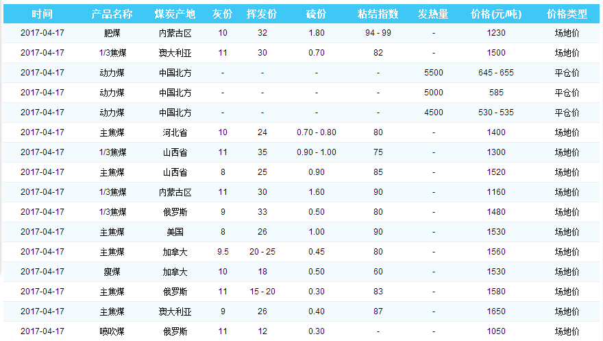 2017年4月17日曹妃甸港煤炭价格