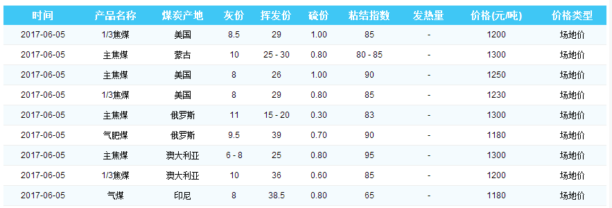 2017年6月5日京唐港煤炭价格