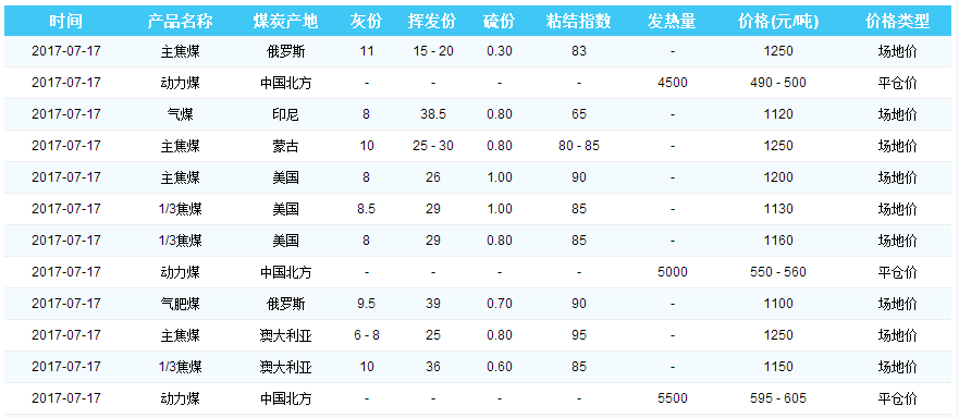 2017年7月17日天津港煤炭价格