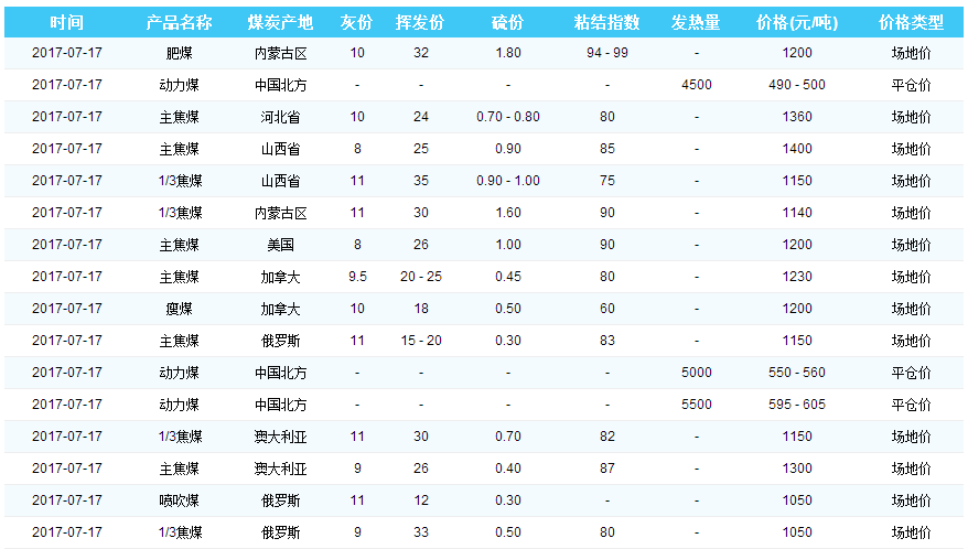 2017年7月17日曹妃甸港煤炭价格