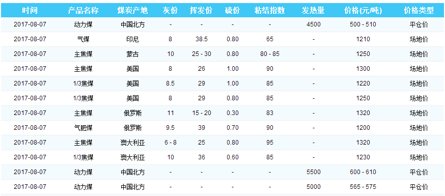 2017年8月7日曹妃甸港煤炭价格