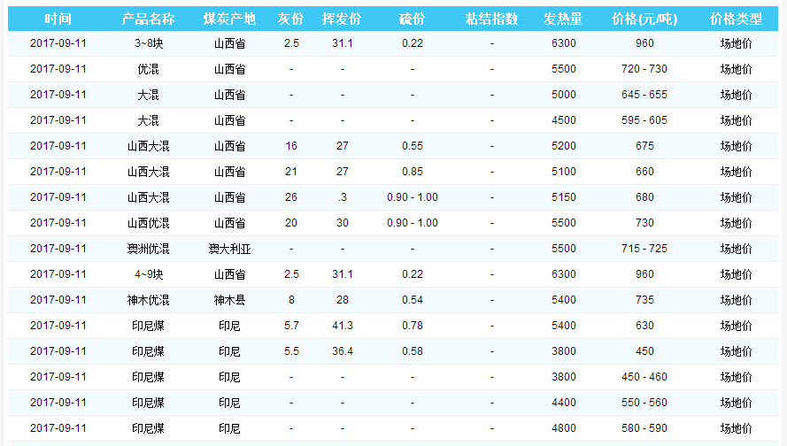 2017年9月11日黄骅港煤炭价格