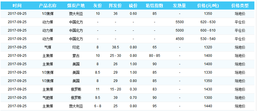 2017年9月25日京唐港煤炭价格