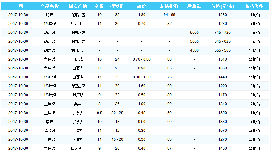 2017年10月30日曹妃甸港煤炭价格