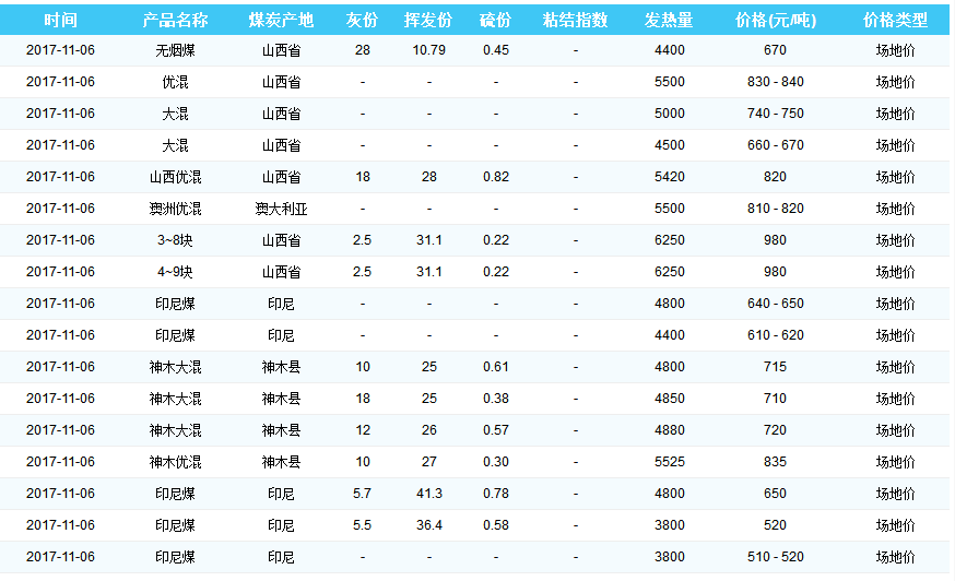 2017年11月6日广州港煤炭价格