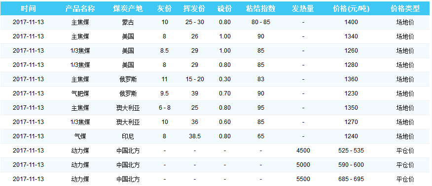 2017年11月13日天津港煤炭价格