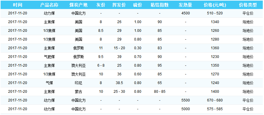 2017年11月20日天津港煤炭价格