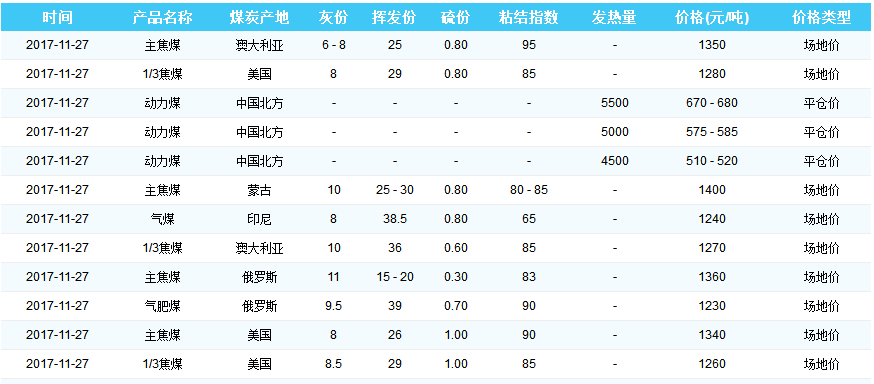 2017年11月27日天津港煤炭价格