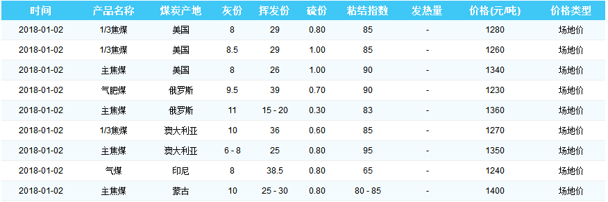 2018年1月2日天津港煤炭价格