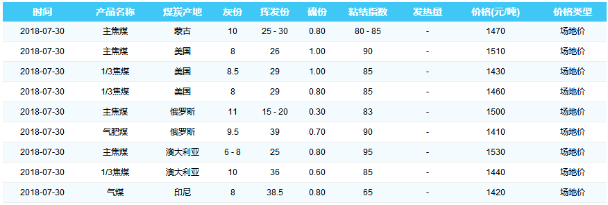 2018年7月30日京唐港煤炭价格